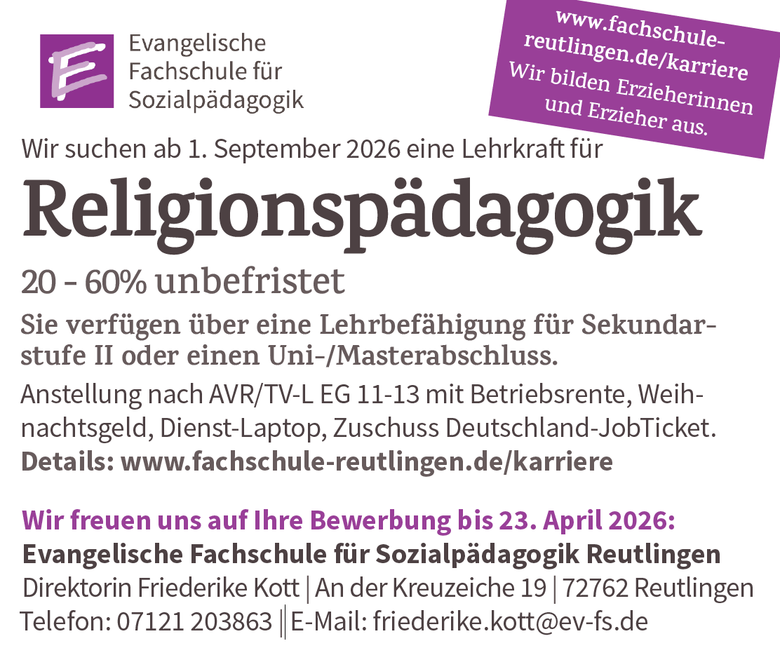 Die Fachschule in Reutlingen stellt zum 01. September 2026 eine Lehrkraft für Religionspädagogik (20-60%) unbefristet ein. Sie sind eine engagierte Persönlichkeit, die eine interreligiöse und interkulturelle Ausrichtung mitbringt und offen für unterschiedliche Glaubensrichtungen ist? Dann freuen wir uns auf Ihre Bewerbung bis zum 23. April 2026. Mehr…