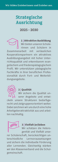 Wir bieten unseren Schülerinnen und Schülern in Zusammenarbeit mit verlässlichen Kooperationspartnern ein attraktives Ausbildungsangebot mit hoher Unterrichtsqualität und erkennbarem evangelischem und friedenspädagogischem Profil. Wir unterstützen pädagogische Fachkräfte in ihrer beruflichen Professionalität durch Fort- und Weiterbildungsangebote.